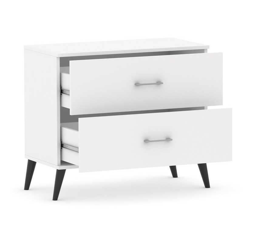 Komoda posiada 2 szuflady zamontowane na prowadnicach kulkowych z pełnym wysuwem. Wysokość frontu to aż 25,5 cm !