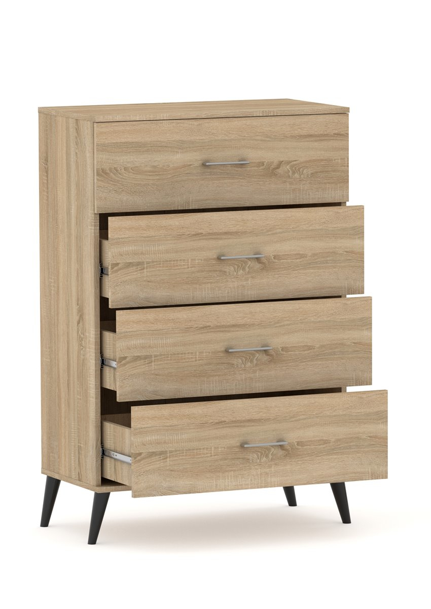 Komoda posiada 4 szuflady zamontowane na prowadnicach kulkowych z pełnym wysuwem. Wysokość frontu to aż 25,5 cm !