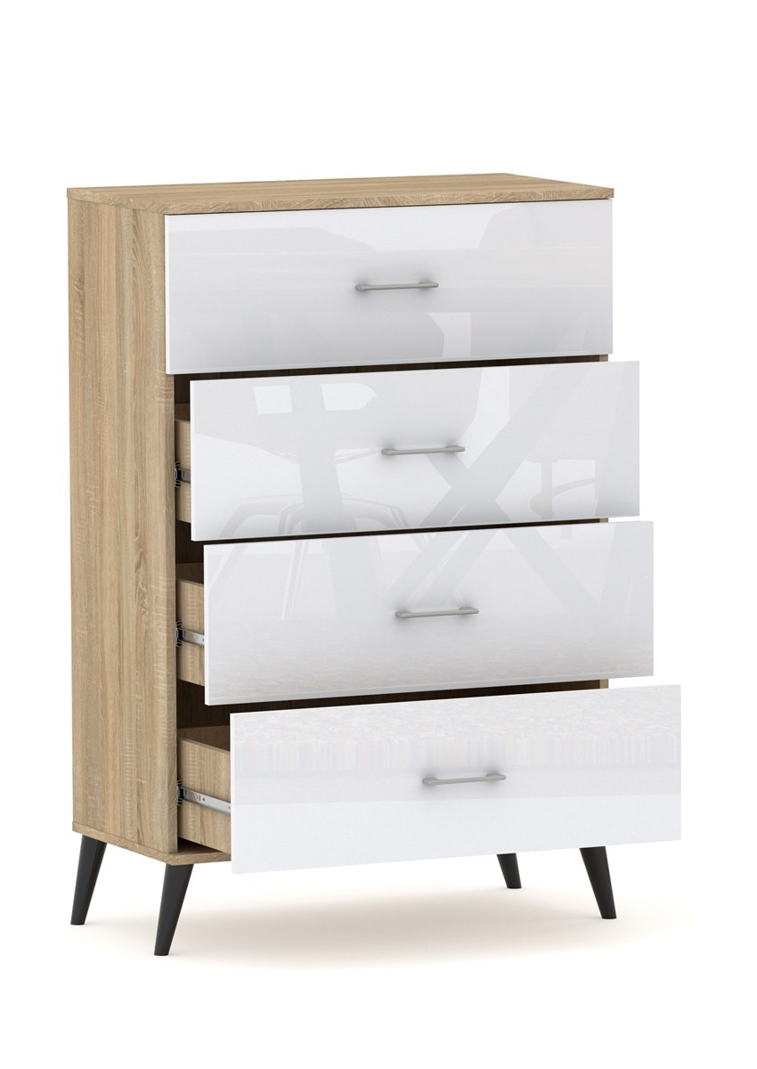 Komoda posiada 4 szuflady zamontowane na prowadnicach kulkowych z pełnym wysuwem. Wysokość frontu to aż 25,5 cm !