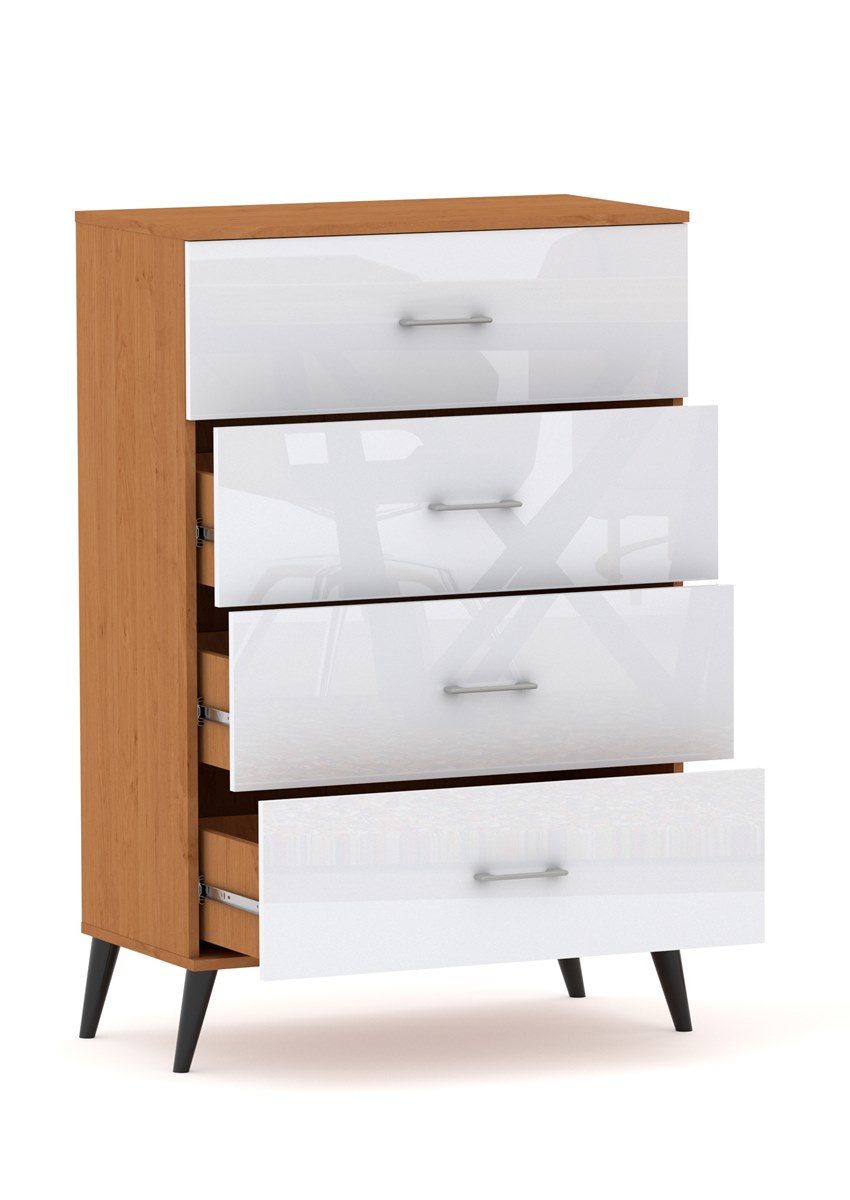 Komoda posiada 4 szuflady zamontowane na prowadnicach kulkowych z pełnym wysuwem. Wysokość frontu to aż 25,5 cm !