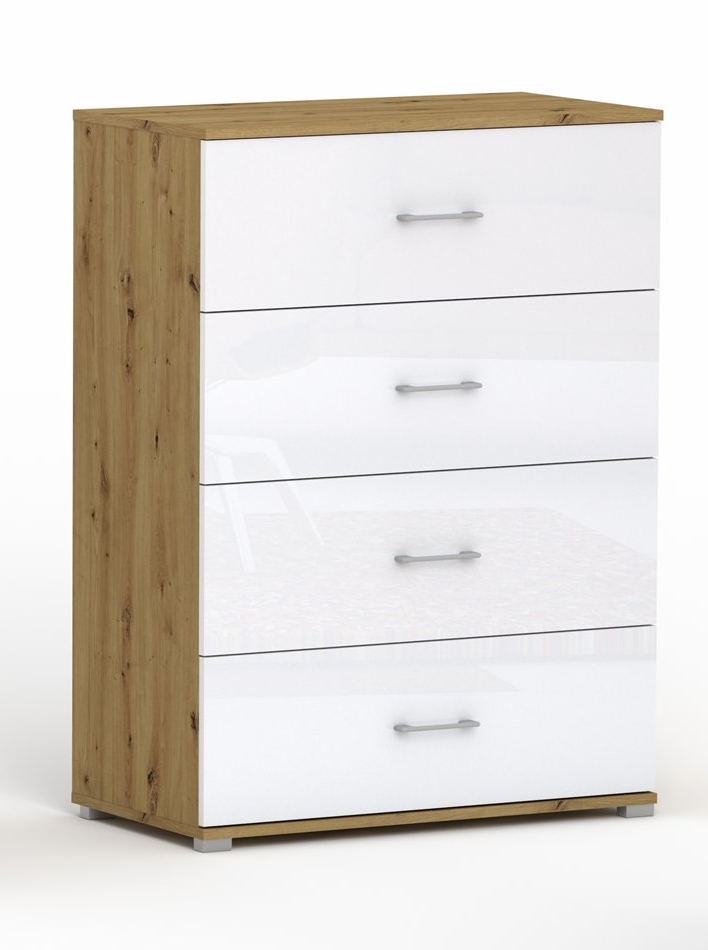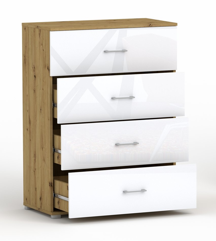 Komoda posiada 4 szuflady zamontowane na prowadnicach kulkowych z pełnym wysuwem. Wysokość frontu to aż 25,5 cm !