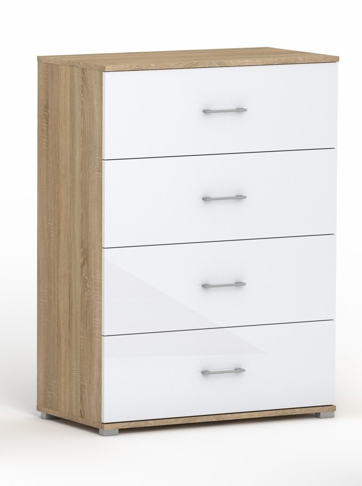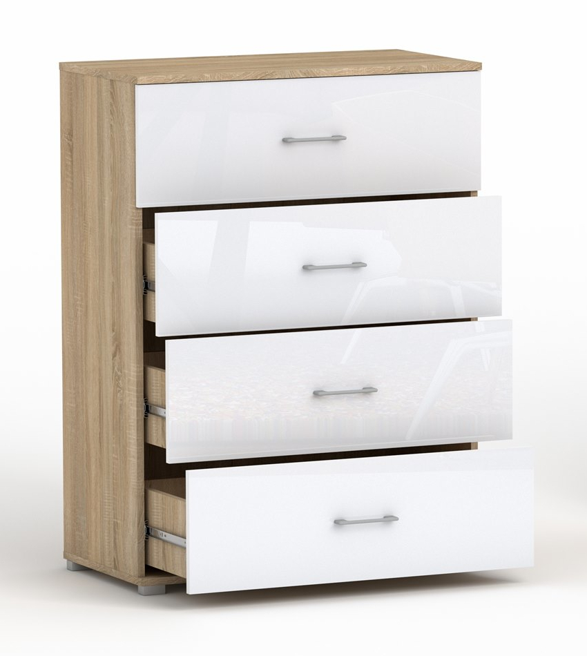 Komoda posiada 4 szuflady zamontowane na prowadnicach kulkowych z pełnym wysuwem. Wysokość frontu to aż 25,5 cm !
